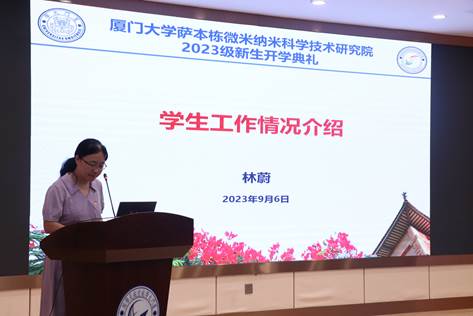 春秋代序,岁月峥嵘。九月的厦门大学随新生的到来焕然一新。9月6日下午,萨本栋微米纳米科学技术研究院2023级新生开学典礼在全体师生共唱国歌的主旋律下拉开帷幕。院长洪明辉,副院长王敏,党委副书记林蔚,教师代表祝青园、杨扬、刘暾东、郑高峰、邵桂芳和辅导员刘群、倪建超及教学秘书蔡晓萌、肖丽丽等出席活动。仪式由副院长王敏主持。