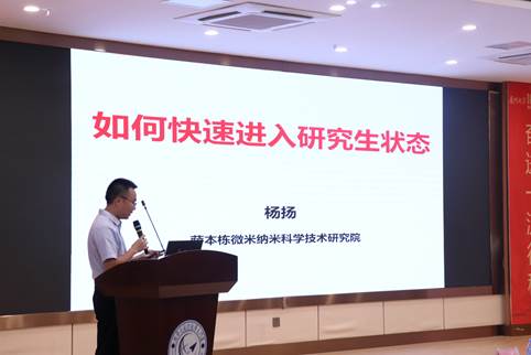 杨扬教授向新生们讲授开学第一课,推心置腹地与新生们分享高效科研的经验。他表示,新生应当做到以下几点:一、做好人生规划,与导师讨论制定培养计划;二、处理好师生关系,争取导师和同门的更多帮助;三、掌握常见方法,高质量完成论文或课题。同时他期待新生们能够成为具有积极人生态度的人,脚踏实地科研,具备责任心,学会换位思考,待人接物自信而谦卑。同学们均表示,干货满满、受益匪浅。