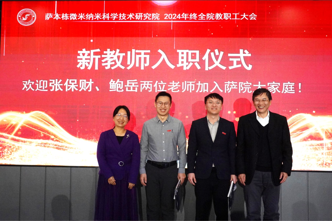 大会为张保财、鲍岳两位新教师举行了入职仪式,廖书记与洪院长向他们颁发了《萨本栋传》和院服并佩戴校徽,欢迎他们加入研究院大家庭,希望他们传扬本栋精神,致知无央、充爱无疆,为党育人、为国铸器。