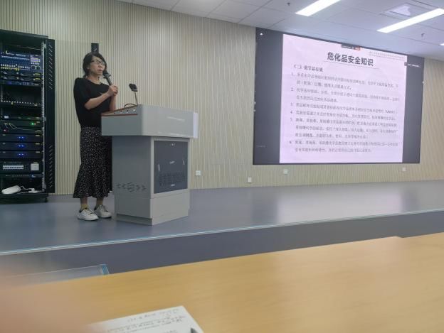 随后,崔景芹老师详细介绍了研究院安全管理制度体系,并聚焦危化品安全开展专项培训,内容涵盖相关管理制度、采购与存储规范、安全操作流程、危废处置要求及应急预案等重点环节。她还就水电安全、气瓶使用安全、常用设备操作规范等作了系统讲解,并通过真实事故案例进一步强化学生的安全认知。