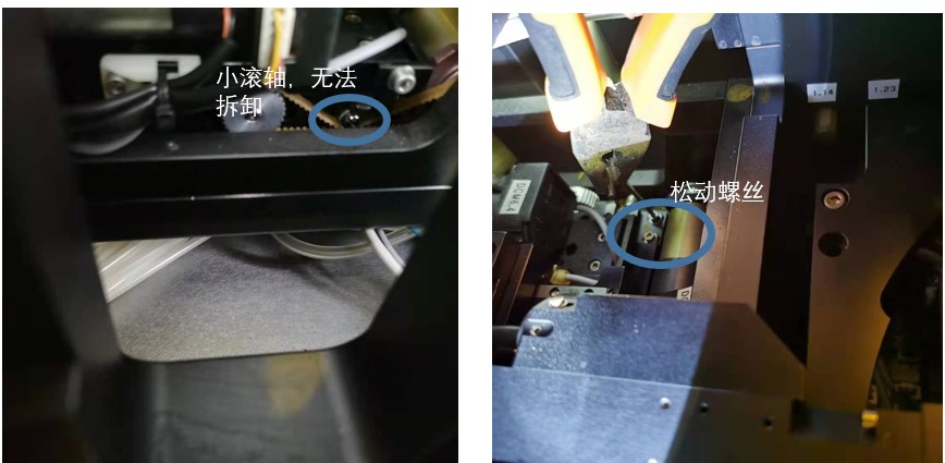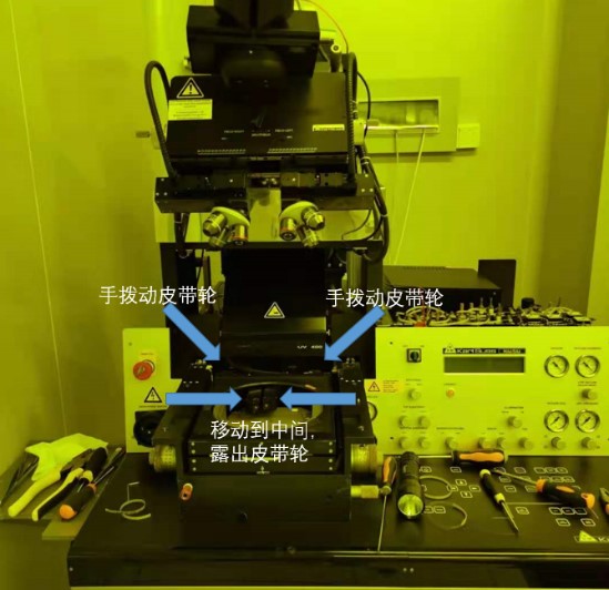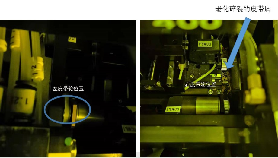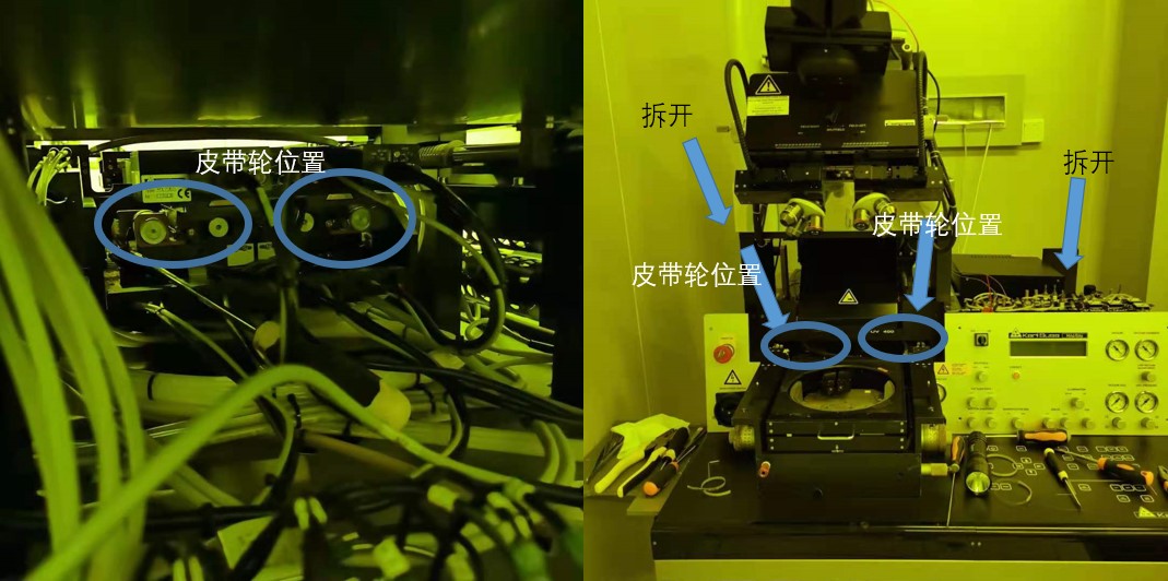 维修团队凭借丰富维修经验迅速制定故障原因排查、排除方案:首先,计划通过手动挪动皮带轮,查看显微系统能否复位,以判定皮带轮是否失效。在实际开展过程中发现手动操作困难很大——皮带轮的安装位置在设备的曝光系统下方,非常隐蔽、可操作空间相当狭小,视野内只能判断大概位置,无法看到细节;尝试让手掌和手腕最细的女同事将手掌塞进设备狭窄的缝隙中,用手指轻轻拨动皮带轮,发现右边显微镜头无任何动作,由此初步判断,皮带轮失效。