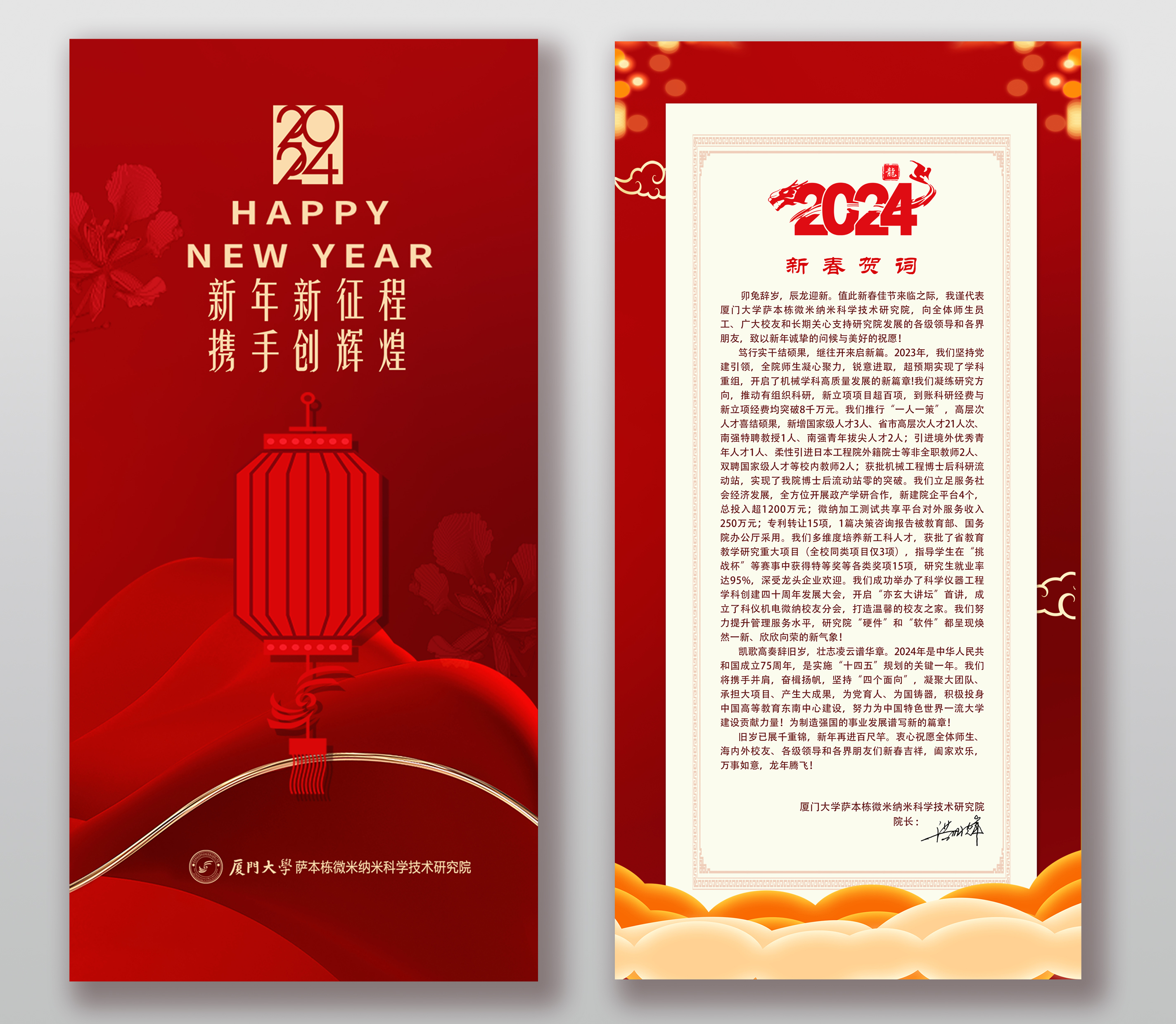 卯兔辞岁,辰龙迎新。值此新春佳节来临之际,我谨代表厦门大学萨本栋微米纳米科学技术研究院,向全体师生员工、广大校友和长期关心支持研究院发展的各级领导和各界朋友,致以新年诚挚的问候与美好的祝愿!