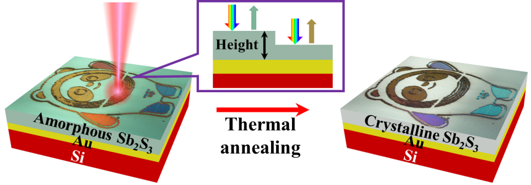 在彩色显示技术领域,传统的彩色显示技术采用染料、色素等色彩吸收材料进行光谱滤波显色,存在使用寿命较低、褪色、不环保、色彩串扰等问题,造成色彩吸收材料在高分辨显示、成像等应用上面临较大的挑战。对比传统显色技术,通过结构产生的色彩即结构色,如彩虹与肥皂泡、孔雀羽毛与蝴蝶翅膀等,具有更高的亮度、更小的尺寸、不褪色、环保等特性,在彩色显示、成像技术、防伪技术上具有很大的优势。随着纳米加工技术的发展,具有高自由度光谱调控能力的人工纳米结构如超材料、超表面为结构色领域提供了一种新的技术手段。然而大部分结构色研究工作主要是设计单元结构的尺寸大小、形状以及周期等几何特征,基于等离子体共振等物理机制,产生多种颜色,缺乏有效的动态调控能力。具有色彩动态调控能力的结构色成为重要发展方向。目前基于液晶分子等光学参数动态可调材料的显示技术已展现出动态调控结构色的能力,但其存在颜色易失、耗能大、响应速度慢的问题,极大地限制了其应用场景。因此,如何实现非易失、快速、动态显示,仍然是一个挑战。