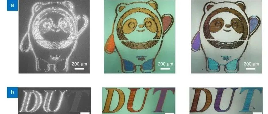 研究人员还展示了该技术动态循环显色以及动态显示彩色图像的能力。通过调控激光的功率,循环调控硫族玻璃的晶格状态,实现样件青色和红色之间的循环变色。利用激光直写系统,制备出彩色“冰墩墩”和“DUT”图案,并通过加热实现“冰墩墩”和“DUT”变色,并且每种颜色状态无需能量维持,具有非易失特性。