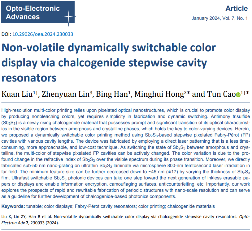 文章 | Liu K, Lin ZY, Han B et al. Non-volatile dynamically switchable color display via chalcogenide stepwise cavity resonators. Opto-Electron Adv 7, 230033 (2024).