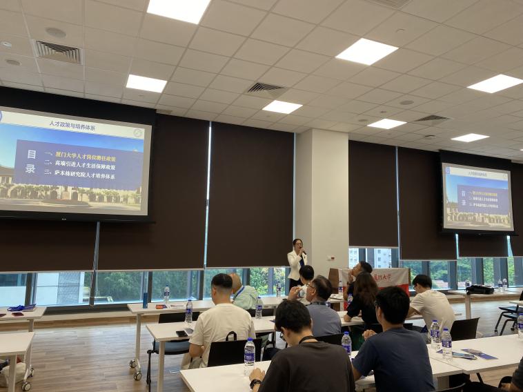 王敏副院长对人才政策和培养体系进行全面介绍,对学校人才岗位聘任政策、南强青年人才、常规师资、博士后、福建省高层次人才、厦门市高层次人才的聘任条件及支持待遇进行细致讲解。她重点介绍了研究院人才培养体系:“一人一策”精准引培人才策略、“全周期支持人才成长”、“总体规划-充分动员-定制指导-全程跟踪”的引培流程等。王敏副院长特别介绍了周詠棠校友捐助母校基金中划拨500万元专门用于研究院人才基金,支持我院人才培育、师生出国(境)访学和深造、高端学术讲座等。