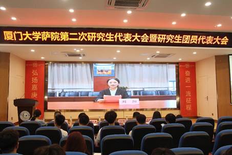值此萨院第二次研究生代表大会暨研究生团员代表大会召开之际,厦门大学研究生会主席团成员刘阳代表校研究生会录制了贺信视频。刘阳首先代表校研究生会对大会的召开表示热烈祝贺;对长期关心、支持萨院学生工作的领导、老师表达了深深的敬意。随后,刘阳肯定了萨院第一届研究生会、团总支过去一年的工作成果;并鼓励萨院新一届学生干部以完善制度、继承发扬、合作创新、塑造形象为落脚点,找准价值定位,打造更多品牌活动。