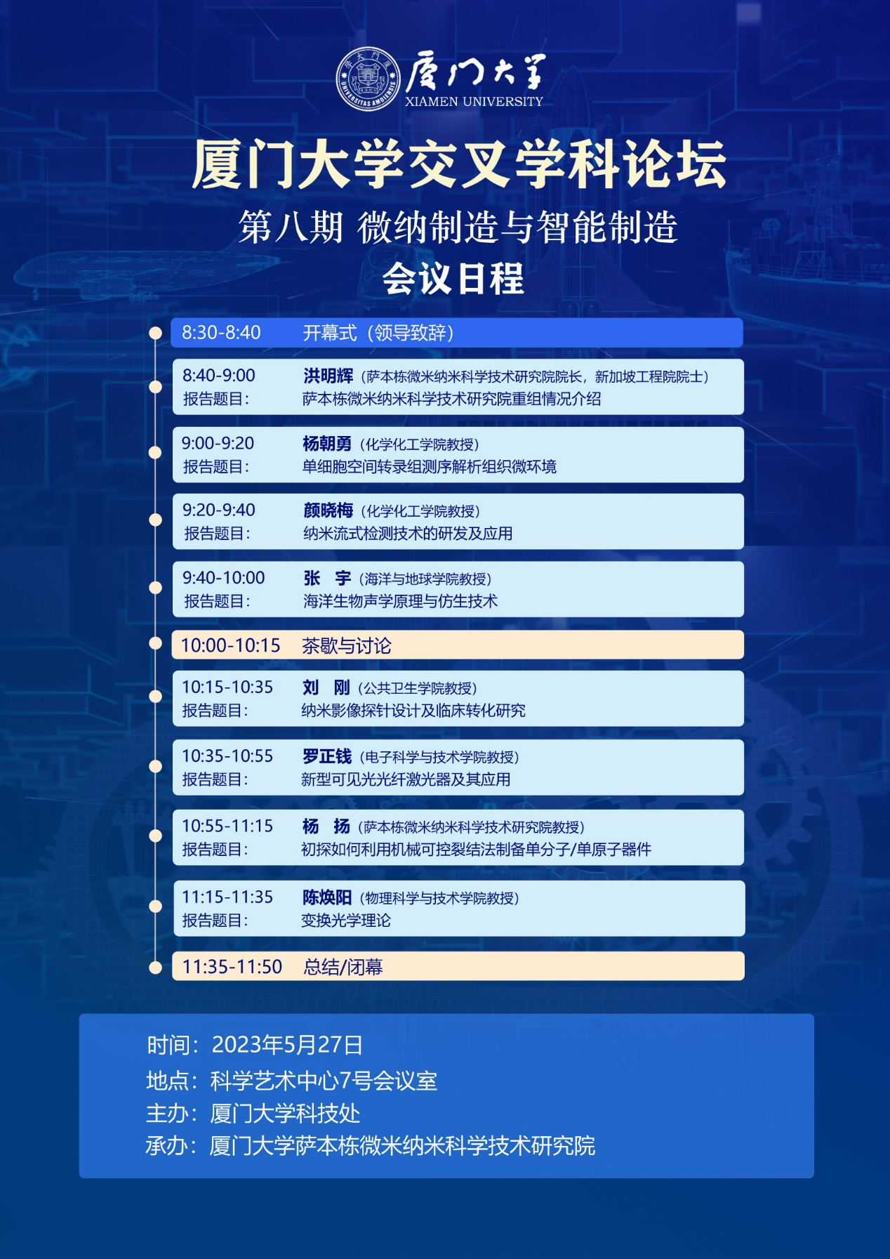 为进一步深化和完善学科交叉融合协同机制,营造活跃宽松的跨学科交流环境和研究文化,促进学校交叉学科领域的快速发展,学校于2021年推出“厦门大学交叉学科论坛”系列活动并已成功举办七期。在学校科技处支持下,由我院承办的厦门大学交叉学科论坛第八期“微纳制造与智能制造”主题交流活动将于2023年5月27日(周六)上午8:30在科学艺术中心7号会议室举办