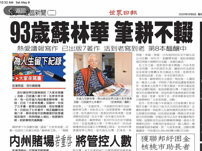 苏林华学长酷爱文学,长期用朴实、平和,且真挚感人的文字回忆在厦大时期的师长与同窗,记忆力之好令人赞叹。他在泰国时利用业余时间出版了《苏林华文集》、《共饮长江水》与《雨雪霏霏集》三册文集;在全退休赴美国后,写了《苏林华新文集》、《梦迴鹭江滨》、《杨柳依依集》及《走进世界》四册文集。《杨柳依依集》是他2016年出版的,此时学长年近九旬,依然动手笔耕,令人钦佩不已。对母校故土的拳拳深情、与旧友新知的绵绵厚谊,始终是他文章的一大重心。