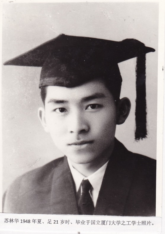 苏林华学长,1927年2月生于中国福建福州,祖籍福建古田,1948年6月毕业于国立厦门大学机电工程系,获得工学学士学位。