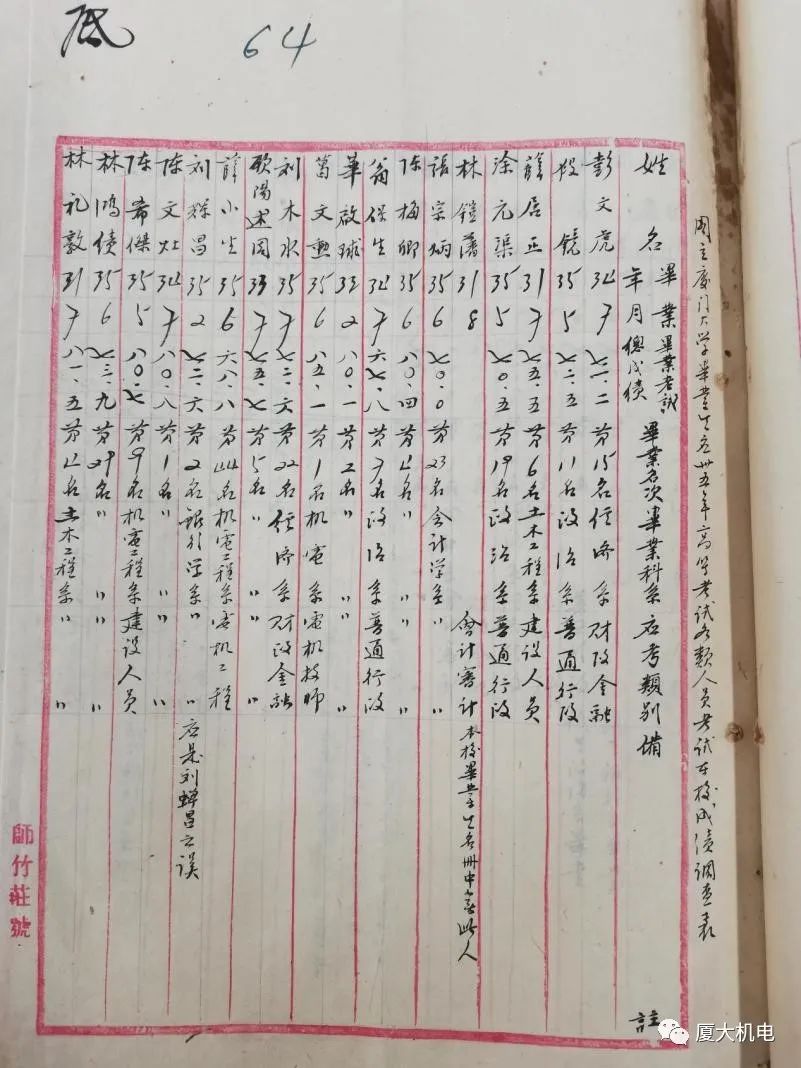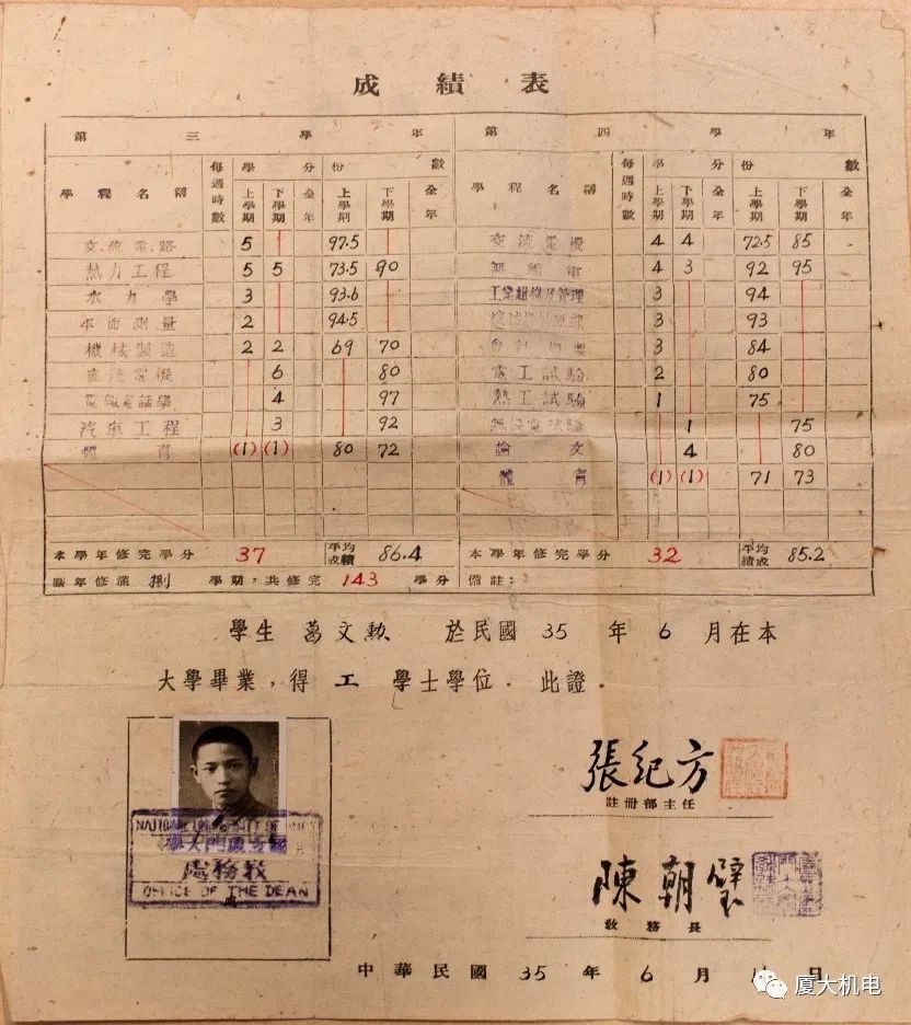 葛文勋先生厦门大学求学时期与导师名单 葛文勋先生毕业成绩单(左起第九)