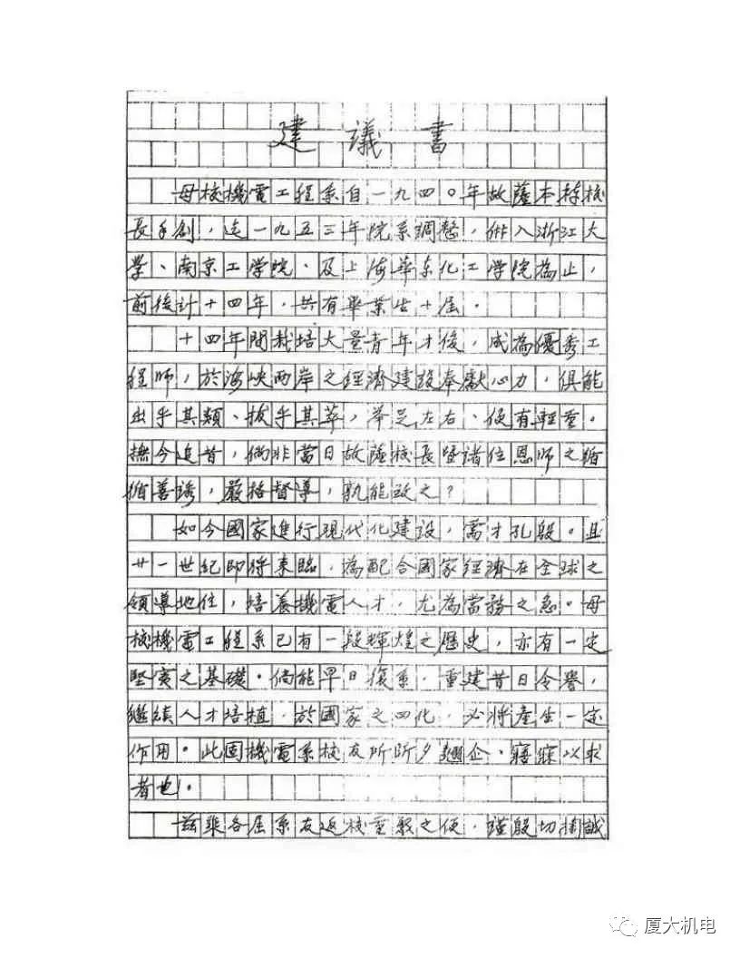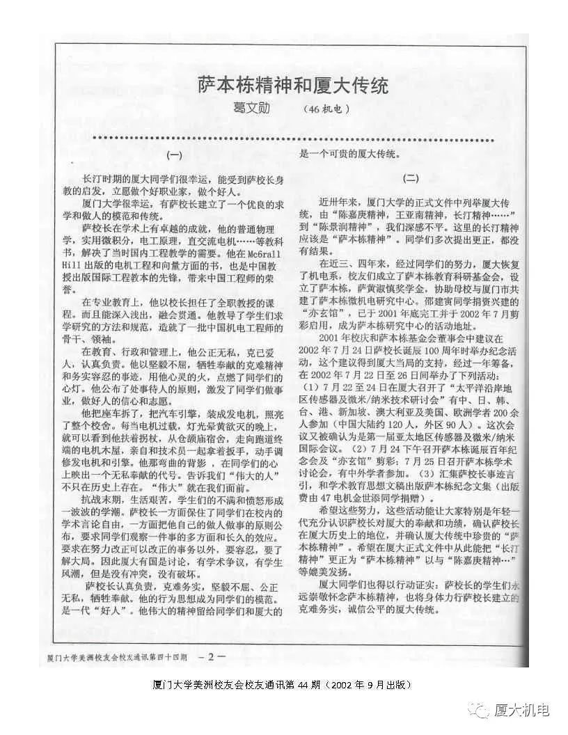 1998年10月,在厦门大学1948届机电系毕业50周年及老机电系系友返校重聚之际,先生提议向母校申请复办机电工程系及成立萨本栋微机电研究中心等事宜,并建议成立筹备小组。此后,先生与何宜慈先生、邵建寅先生和苏林华先生四位老长汀校友向林祖庚校长提交建议书,建议厦门大学复办机电工程系、创立萨本栋微机电研究中心、拟定“微机电系统”的教育研究计划,并得到校方正式复函。