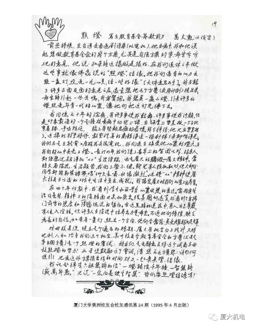 先生在厦门大学求学期间,时逢学校内迁长汀办学之际,在八年的战火纷飞中,在民族存亡的关键时刻,厦门大学在萨本栋校长带领之下,始终弦歌不辍、自强不息坚持办学。在先生的心里,这样一位大爱无疆的校长,高瞻远瞩之创见、鞠躬尽瘁之德范,为学生撑起一片广阔的天地。就如先生在《点灯》中所写“想要一盏小灯,引来许多的灯,照亮年青一代的心灵,让他们把这灯光传下去”,萨本栋校长用他心灵的火,点燃了长汀学子心灵的灯塔。先生于2002年9月写了《萨本栋精神和厦大传统》一文,深切缅怀萨本栋校长认真负责、勇敢创新、克难务实、克己爱人、坚毅不屈、无私无我、牺牲奉献的精神。