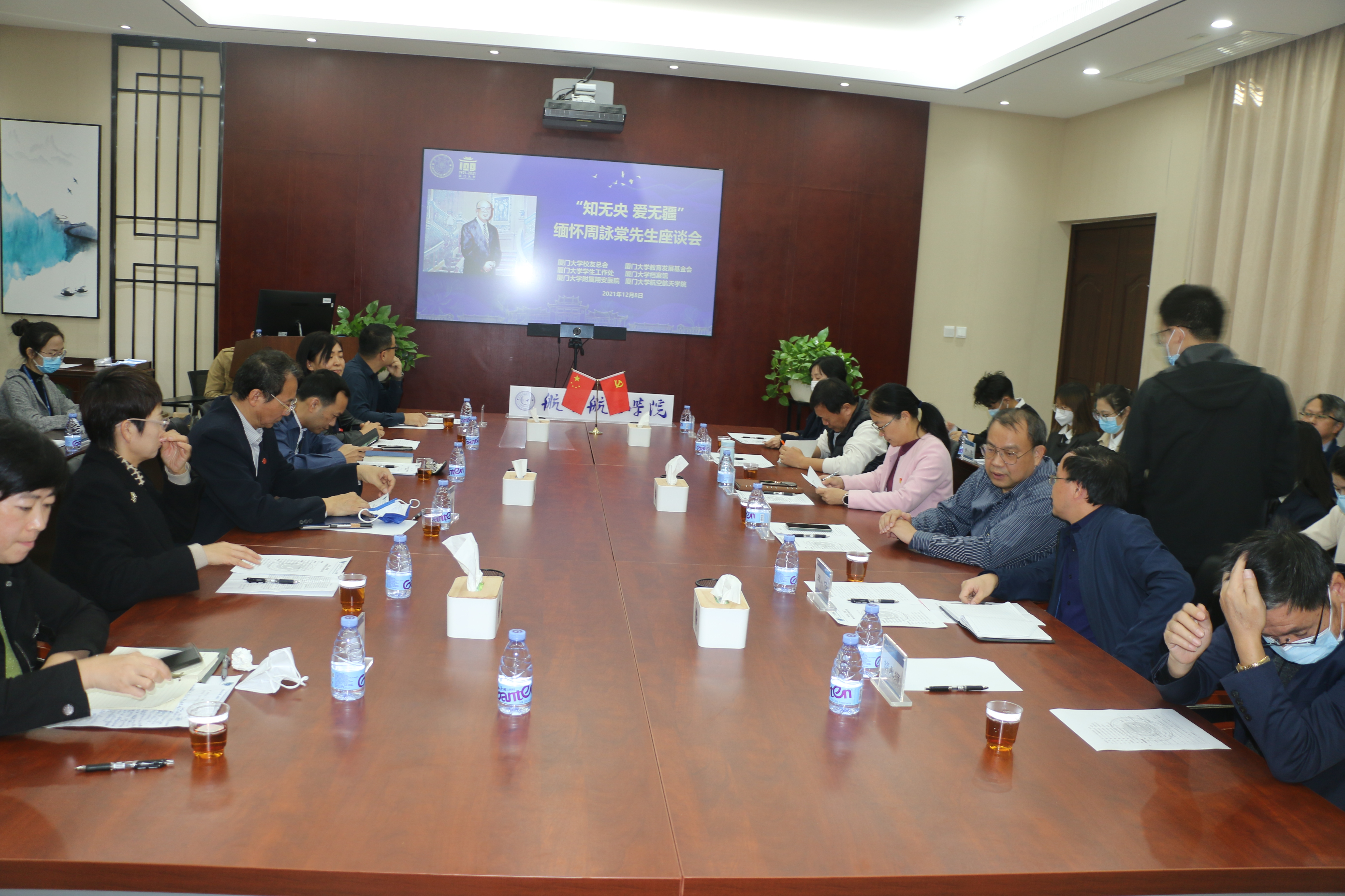 12月8日上午,“知无央,爱无疆”——缅怀周詠棠先生座谈会在航空航天学院院楼501会议室举行。校友总会副理事长赖虹凯、学生工作处处长李峰、档案馆馆长石慧霞、校友总会秘书长张伟、基金会副秘书长赵晓慧、校友总会秘书处副秘书长郑辉、附属翔安医院设备物资部负责人胡永狮、航空航天学院党委书记王康平、副院长周伟、学院姚斌教授,以及周詠棠助贷学基金受助学生代表和航空航天学院师生代表出席了座谈会。活动由航空航天学院党委副书记林蔚主持。