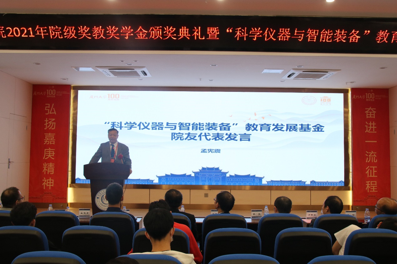 “科学仪器与智能装备”教育发展基金捐赠院友代表孟宪震发言,他回忆了在厦门大学的求学生涯,回顾了厦门大学工科的发展进程,表达了对学院发展的美好期待和对同学们的殷切期盼。