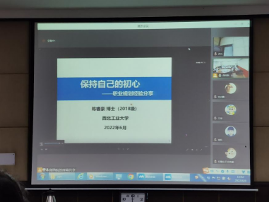 分享会特邀了研究院2021届毕业生,目前就职于西北工业大学任职教授的陈睿豪(2018级博士生)、就职于江西井冈山经济技术开发区任职基层公务员的陈新(2018级硕士生)。两位优秀毕业生通过线上方式,向与会师生详细分享了自己的求职心得、工作感受,得到学弟学妹们的热烈相应。