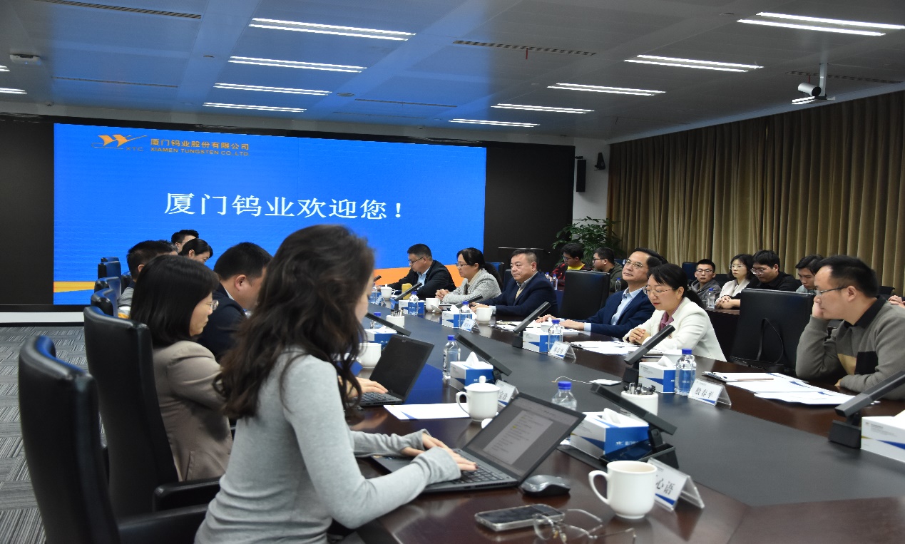 为深入贯彻落实习近平总书记关于高校毕业生就业工作重要指示精神,拓宽毕业生就业渠道和资源,加强与用人单位的交流合作,1月3日下午,厦门大学党委常委、副校长邱伟杰,航空航天学院党委书记廖志丹、国内合作办副主任吴喜平、航空航天学院党委副书记林蔚、航空航天学院及萨本栋微米纳米科学技术研究院师生代表一行赴厦门钨业股份有限公司(以下简称厦门钨业)拓岗调研。厦门钨业党委书记、董事长黄长庚,党委副书记、总裁吴高潮,办公室主任王玉龙,技术中心副主任范超颖,人力资源管理中心薪酬激励高级经理赖宝珍等接待了调研团。