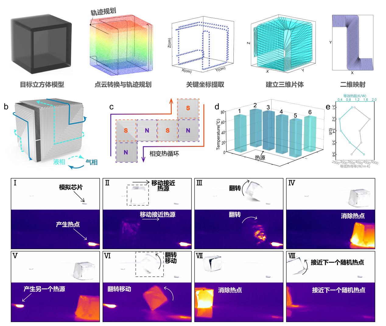 为解决随机热点的散热难题,团队提出了相变散热机器人的概念。以密闭立方为设计目标,将3D随形热管设计为一个封闭的立方体,立方体的每个壁面均为具有气液两相循环的热管结构,且各个壁面实现了内部三维气液传输路径的互通。结合磁控翻转的驱动方式,使相变散热机器人能够通过磁场控制快速接近并覆盖随机生成的热点坐标,将底部热源通过气液传输路径进行散热,迅速放大热点的对流散热面积以防止热量的进一步积聚。该应用理念为高热流密度电子芯片随机热点的主动散热提供了有效的解决方案。