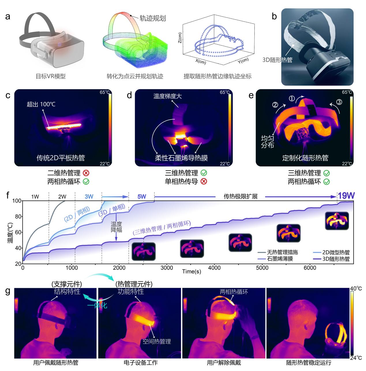 3D随形热管具备散热-支撑协同的应用特点,除了具备两相热循环功能外,能够作为作为电子设备的内部支撑或外壳等支撑元件,进一步增强电子设备的紧凑性。针对VR设备的特殊构型,开发了定制化3D随形热管,在发挥热管高效散热的同时,作为头戴式组件的一部分,允许电子芯片热量直接与外部空气进行自然对流,将芯片的热量通过三维路径进行散热,在有限的组装空间内使散热面积最大化。结合相变散热面积的放大及三维构型对极限功率的提升,与商用散热策略相比,在同功率下,VR设备的温度分别降低了48.59%和38.62%,传热极限增加了4.75倍。