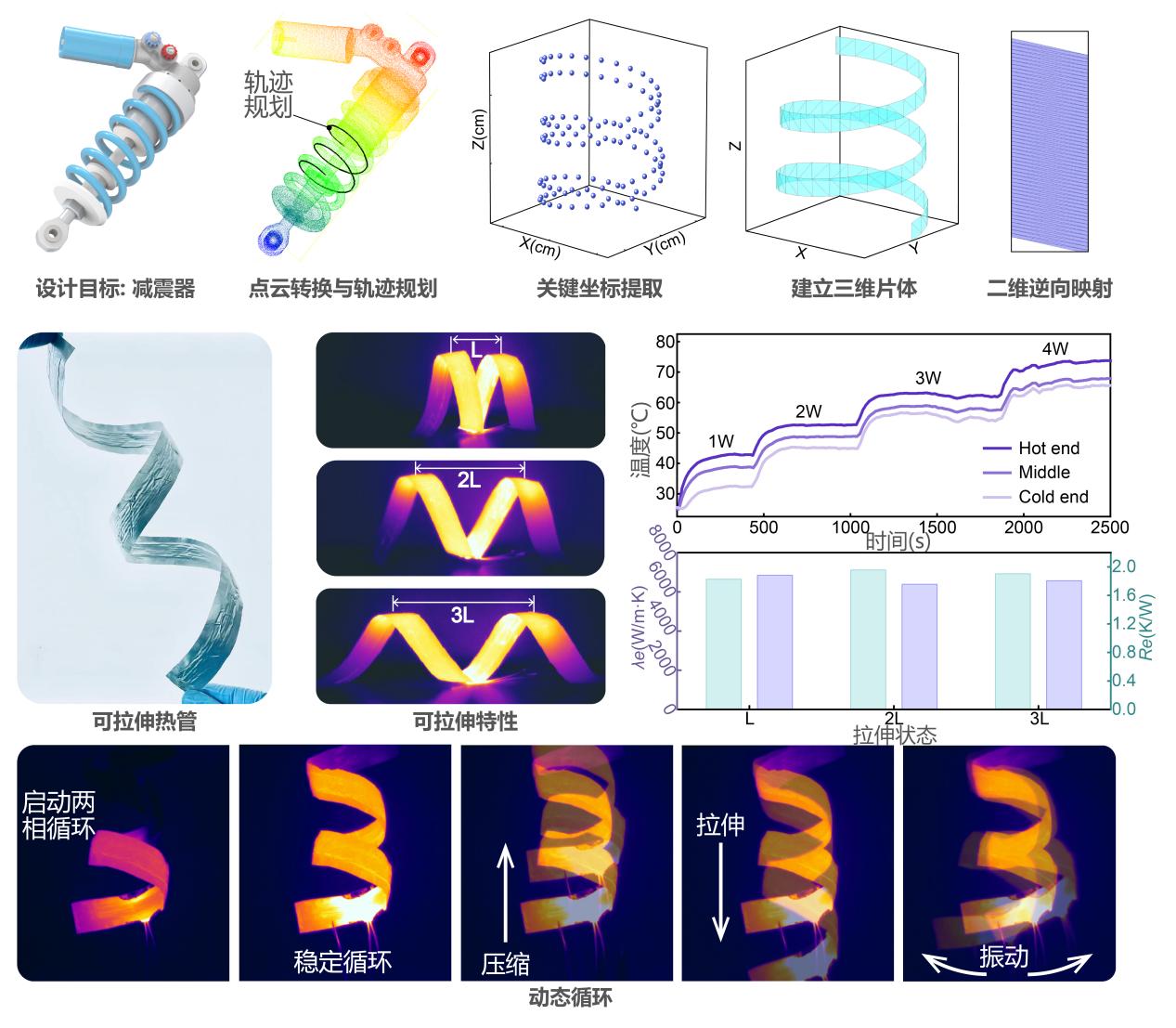 利用 3D随形热管的高自由度设计特点,开发了一种具有螺旋三维形状的可拉伸热管,类似于减震器中的弹簧部件。该结构允许热管进行长距离动态拉伸、压缩和振荡,其功能类似于弹簧,能够适应多平面之间的动态空间关系,确保稳定的热量传输。团队开发的可拉伸热管具备自身长度大三倍的拉伸范围,其有效导热系数为5335W/m·K。对可拉伸热管进行了200次的拉压循环测试,展示了可拉伸热管在相变循环过程中优异的动态稳定性。