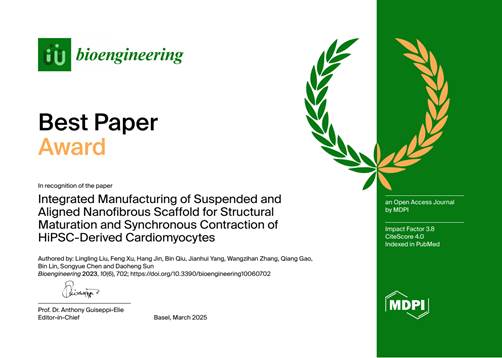 我院孙道恒教授团队在Bioengineering期刊上发表的论文“Integrated Manufacturing of Suspended and Aligned Nanofibrous Scaffold for Structural Maturation and Synchronous Contraction of HiPSC-Derived Cardiomyocytes”(Bioengineering, 2023, 10, 702),在1411篇论文中脱颖而出,荣获该期刊2023年的年度最佳论文奖!Bioengineering最佳论文每年颁发一次,以表彰具有高质量、科学意义和广泛影响力的出版物。评选委员会主要根据论文的科学价值及影响力、原创性、及发表后一年内的引用及下载情况等标准,评选出前一年发表的两篇质量卓越的文章,在3月底在线公布并给与奖励。