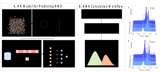 (左)训练神经网络(NN)模型的方法。捕捉不同浓度下的各种结构,并提取Li⁺的溶剂化结构。随后,使用描述符对结构进行编码,并计算其相应的化学位移。(中)NMR谱预测流程。使用机器学习分子动力学(MLMD)模拟生成轨迹,然后利用所得到的核磁共振预测神经网络模型来获取核磁共振光谱。(右)NMR谱预测结果与实验结果的对比。