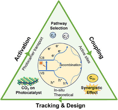 但是,光还原二氧化碳当前性能还不足以满足化工实用性需求,表现为能量转化率和产物选择性不高,高附加值多碳产品不易获得,主要原因包括光生载流子易复合、反应活性不易调控等。