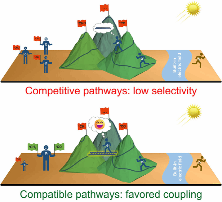 对于较难获得的多碳产物,文章针对材料表面相邻活性位点强调了相邻活性的适配协同机制对于诱发二氧化碳还原过程中间体耦合反应的重要性。