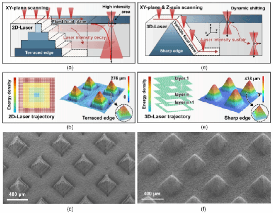 在透明聚合物微结构加工中,传统2D激光工艺采用固定焦点,通过局部能量调控实现不同区域、不同深度的材料去除。这种方式能量分布不均,常导致边缘呈阶梯状、结构粗糙。研究团队对比实验发现,尽管2D激光能实现一定的三维形貌,但需复杂能量控制,且难以避免加工瑕疵。而新提出的3D-DFL技术则通过同步调节激光焦点高度,实现每一层精准加工,保证激光能量均匀分布。与2D激光相比,3D-DFL在构建锥形等复杂结构时展现出更高的光滑度与几何精度,显微镜图像也证实其边缘清晰、无缺陷,展现出显著的加工优势。