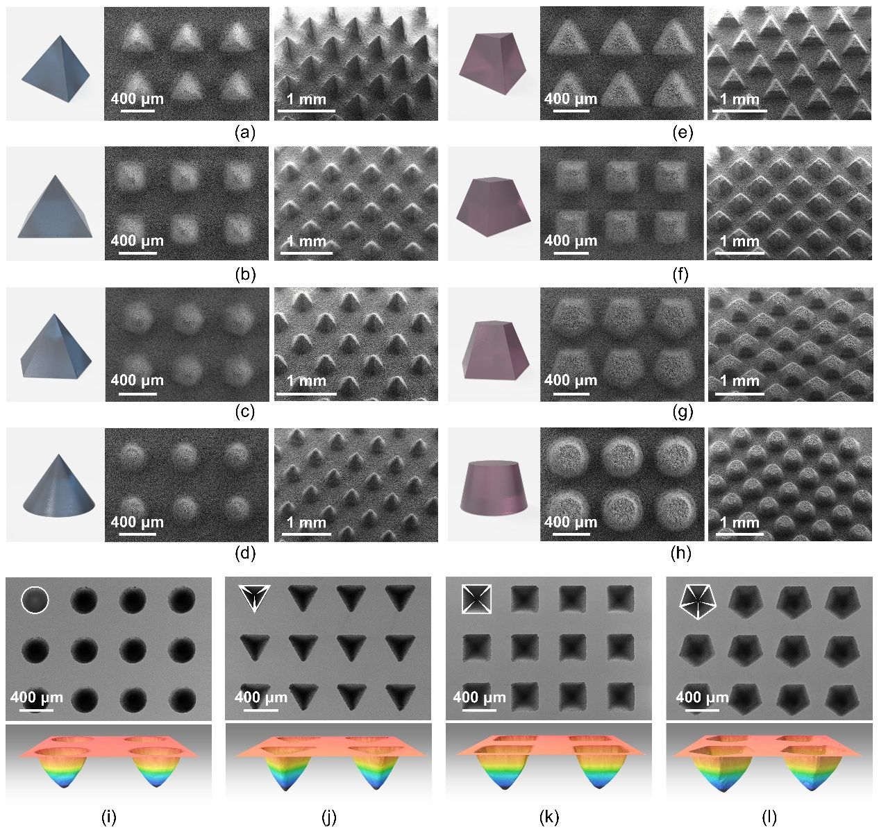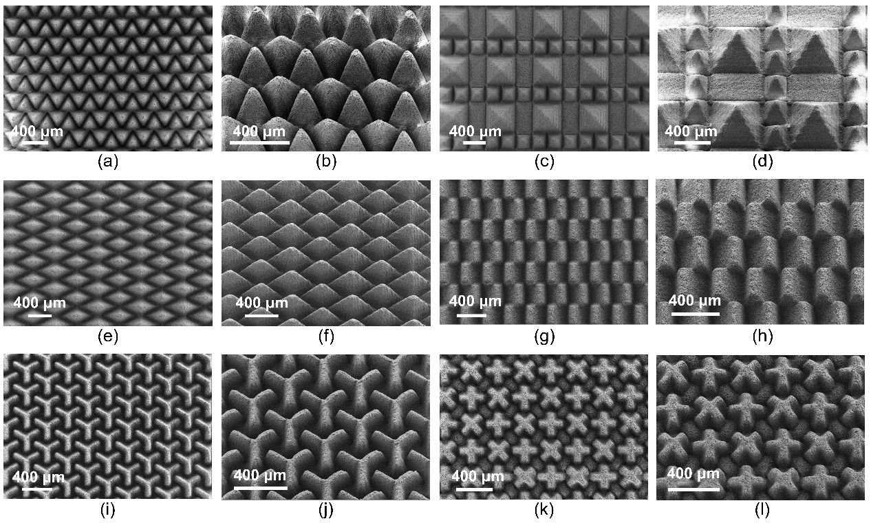 图6 PDMS基底上加工凸起和凹陷的不同类型的棱锥和棱台微结构