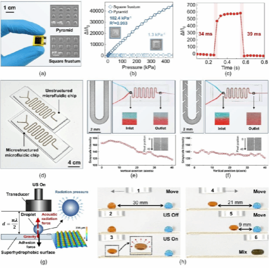 图9 使用3D-DFL方法制造的微结构应用:(a-c) 压阻式压力传感器应用;(d-f) 微流控芯片应用;(g-h) 液滴操控应用