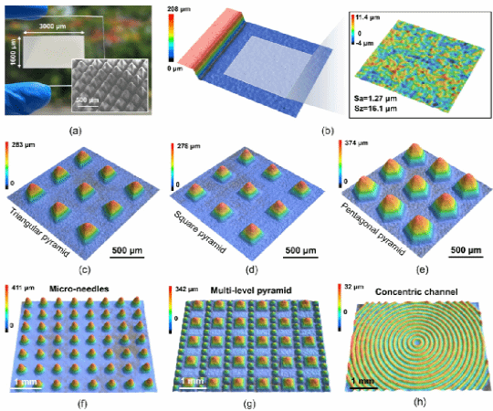 透明柔性聚合物因其优异的光学透明性、柔韧性和生物相容性,广泛应用于微流控芯片、柔性电子、功能表面和生物医学等前沿领域。三维微结构的引入可以显著提升其机械性能、光学特性和流体动力学性能,从而赋予材料一系列新功能。但由于其柔软、易变形、导热性差等特性,导致加工过程中常发生弹性回弹、热积聚、工具粘附和结构坍塌,严重影响成型质量和重复性。由此可见,在聚合物材料表面构建高精度三维微结构始终面临巨大挑战。