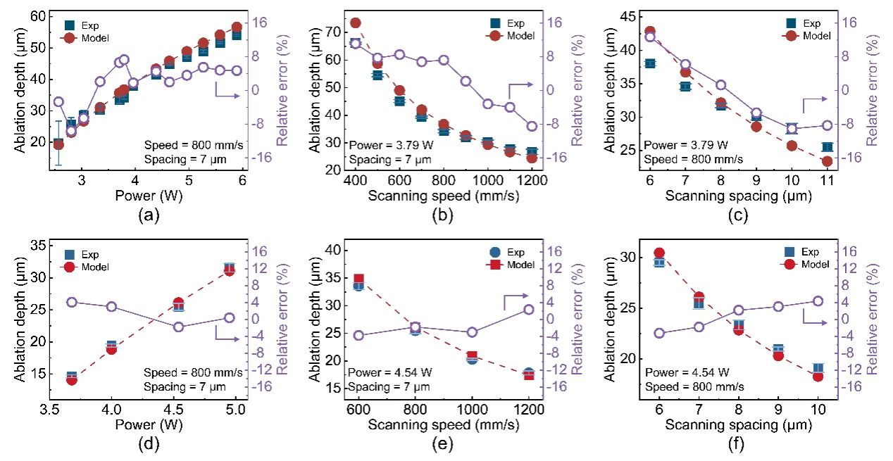 式中,ω为束腰半径、f为激光频率、v为扫描速度、dline为扫描线间距、P为激光功率、Fth为烧蚀阈值、α为材料吸收系数、ξ为修正系数。通过实验获取材料烧蚀阈值与材料吸收系数,即可实现精准预测烧蚀深度。利用该预测模型在代表性聚合物材料PDMS和PET上进行了验证,预测结果的平均绝对百分比误差(MAPE)分别为5.99%和2.68%(见图4)。