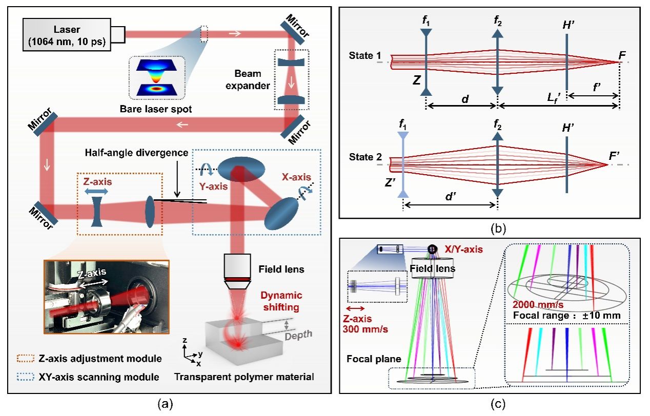 图2 3D动态聚焦激光加工系统与原理:(a)系统设置示意图;(b)动态调焦的工作原理;(c)基于拟议激光制造装置的三轴激光扫描系统的光路模拟结果