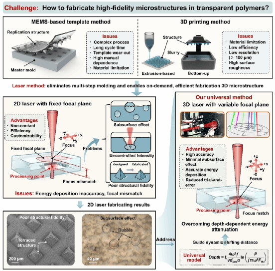 目前主流的模板复制法虽精度高,但流程复杂、成本高、周期长,难以满足定制化和快速迭代的需求;3D打印和双光子聚合等新兴方法则在分辨率、适配材料范围等方面仍存在权衡;传统2D激光加工工艺焦平面固定,难以应对因加工过程中焦点失配导致的能量沉积不准确的问题。因此,亟需一种兼顾精度、效率与材料兼容性的微结构加工技术,以满足透明柔性聚合物器件快速发展的迫切需求。