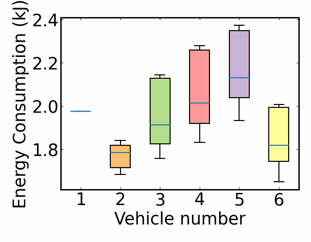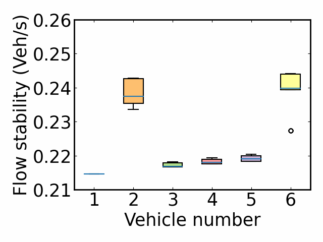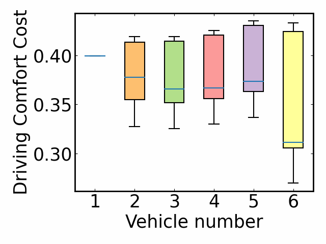 受网络条件波动与环境干扰影响,各阶段通信时延具有随机性,这种随机性会显著影响控制模型性能。为解决这一问题,提出控制模型切换机制。在状态维度相同的前提下,优先选择与检测到的时延值最匹配的模型,确保控制模型在随机时延环境下仍能保持最优性能,实现对随机干扰的鲁棒性。此外,在随机时延下进行 100 次实验,所有评价指标均仅存在小幅波动,且 6号网联自动驾驶车辆的指标中位数优于其前方传统车辆(3~5号车),验证了所提方法对随机时延的鲁棒性。