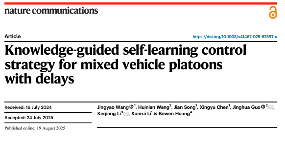 近日,我院郭景华副教授团队与中国工程院院士、清华大学李克强教授团队合作在智能交通与网联自动驾驶领域取得关键突破。研究团创新性地提出通信延迟下知识引导型自学习混合车辆队列控制框架,该框架为网联自动驾驶系统的发展和推广提供了一种可扩展、通用的解决方案。国际顶级综合期刊《Nature Communications》 于2025年8月19日报道了这项研究成果《Knowledge-guided self-learning control strategy for mixed vehicle platoons with delays》。