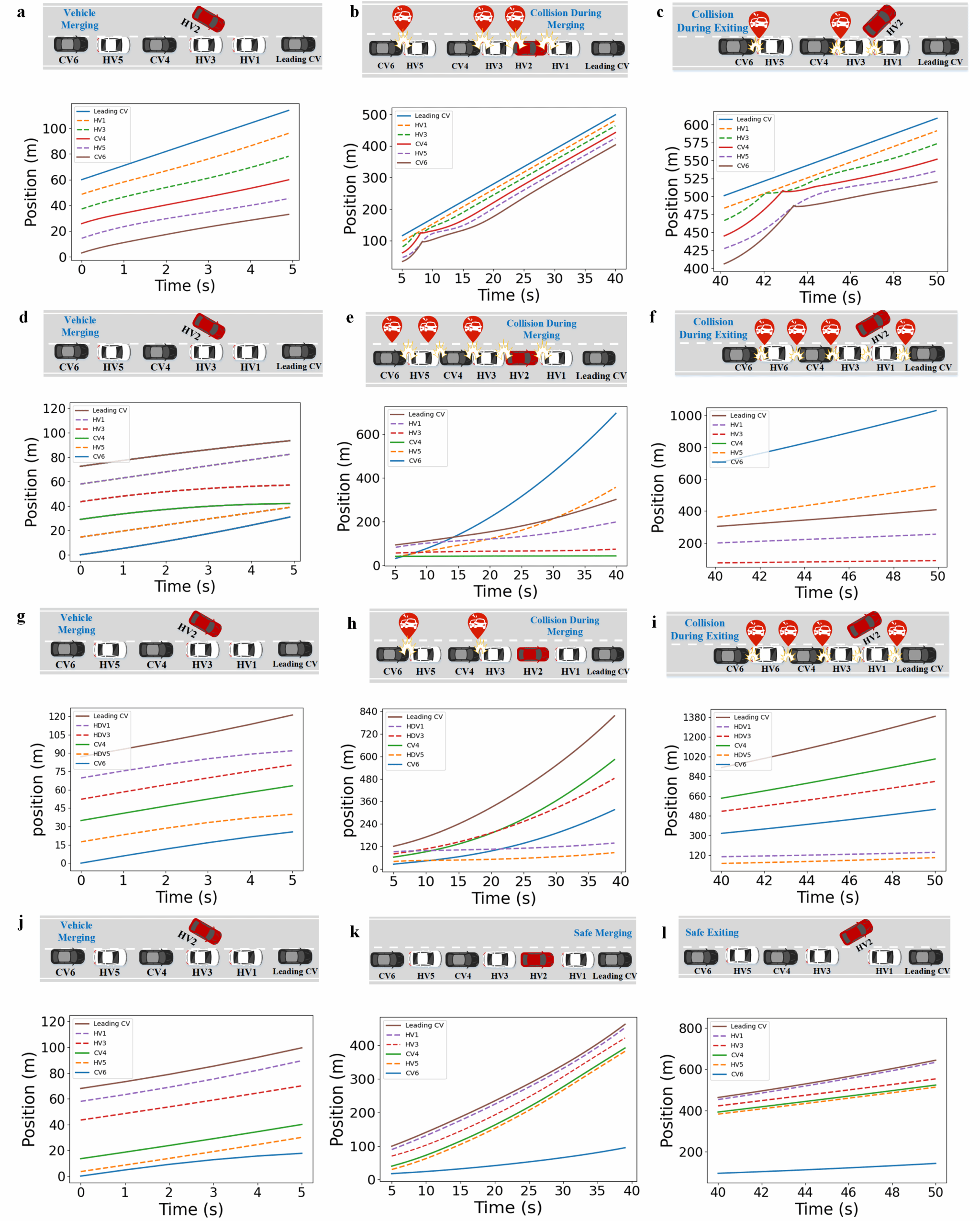 图4. CVDS-IDM、DDPG、PPO及所提策略下,存在人类驾驶车辆换道行为时混合车队的位置曲线(a–c 为CVDS-IDM对应的曲线;d–f 为DDPG对应的曲线;g–i 为PPO对应的曲线;j–l 为所提知识引导自学习策略对应的曲线。)