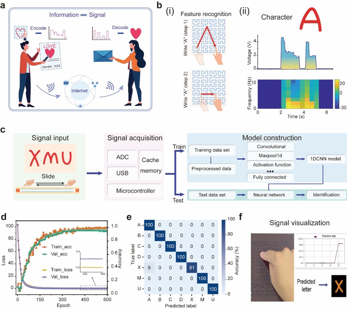 将图像作为信息载体是一种简单直观的策略,有效传递意图。不过,传输包含冗余信息的图像会消耗大量存储空间,在互联网大数据时代,这种消耗愈发不可承受。为了解决这一问题,发送端将包含冗余信息的图像压缩成特定代码,接收端则将其解压缩回图像。逆设计触觉传感器可以设计成转换器,用户在其上绘制图像时,同时生成一维信号作为代码。具体而言,用户可以在传感器上绘制图案或符号表达意图,这些滑动轨迹产生的信号将被转化为代码并传输到接收终端。在接收端,这些代码再被解耦为实际的图像,从而便于信息的快速传输与处理。这一机制不仅简化了信息交流过程,还显著减少了数据传输的存储需求,提高了传输效率和准确性。