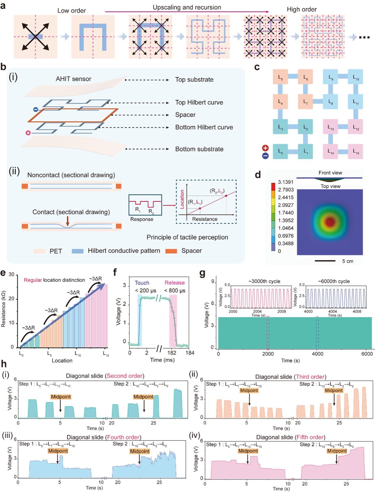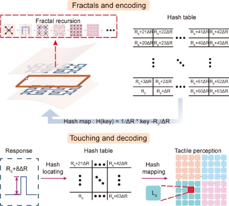 将几何分形与硬件设计深度融合,创新提出一种结构即功能的智能感知单元,并建立适用于触觉传感器的适应性逆向设计范式。该范式通过双层分离结构与希尔伯特曲线结合,以一维信号实现平面全域触觉感知。利用希尔伯特曲线的分形递归特性,在单平面上生成密集位置节点,随节点间距增大,响应电阻呈梯度变化,使传感器通过哈希编码实现自信息存储。作为验证,该传感器可定制应用于多功能人机界面、多维加密及意图传输。该技术有望为机器人、可穿戴设备和元宇宙接口提供高效智能的感知系统,推动人机融合迈向新高度。