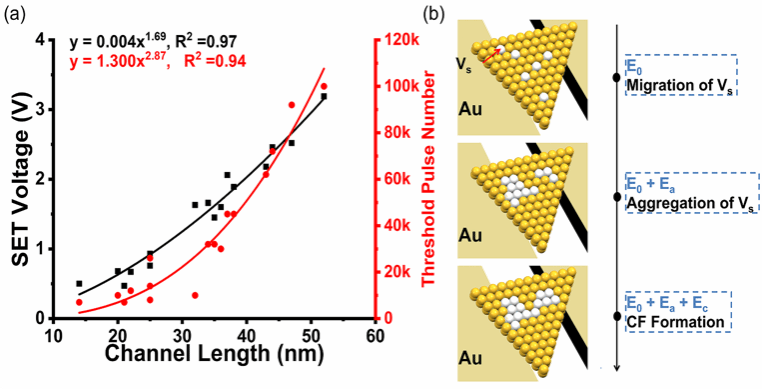 图2. (a) SET电压(黑)、1 V下阈值脉冲数(红)与通道长度的关系;(b)不同电压(电场强度)下阻态切换激活机制