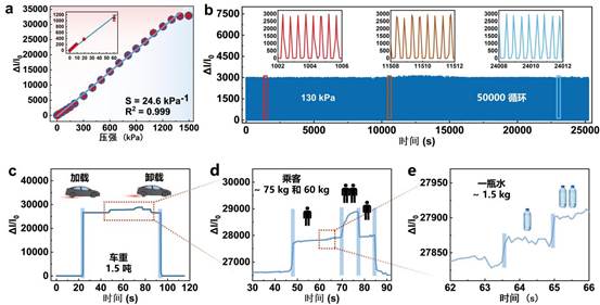 图3 (a) DPyCF@SR传感器性能标定结果;(b) DPyCF@SR传感器5万次循环加载测试结果;(c-e) 车辆预压下的高灵敏压力分辨:1.5吨重轿车载重量变化监测