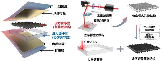 根据灵敏度提升及线性量程拓宽的需求,设计了双面金字塔多孔导电微结构(Double-sided pyramidal carbon foam,DPyCF)和力学调节器(Stiffness regulator,SR)分别作为压力敏感层和压力缓冲层,层叠封装形成传感器整体结构,被定义为DPyCF@SR,其结构如图2a所示。基于三维动态聚焦激光加工技术,实现对传感器压力敏感层和力学调节器的高精度、高效制造。同时,采用高温热解工艺,使金字塔多孔结构获得导电性,并一步缩小了微金字塔结构的尺寸(体积缩小约90%),如图2b所示。
