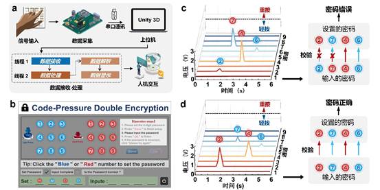 图5(a)密码-压力双重加密锁系统示意图;(b)基于 Unity3D 的密码-压力双重加密锁用户界面;(c-d)一次不成功的尝试和一次成功的解锁尝试