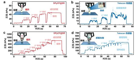 图4 (a) 配有DPyCF@SR传感器机器人抓40 g豆腐块;(b) 配有Tekscan商用传感器机器人抓40 g豆腐块;(c) 配有DPyCF@SR传感器机器人抓900 g铁块;(d) 配有Tekscan商用传感器机器人抓900 g铁块