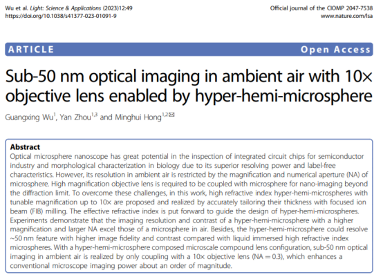 近期,我院洪明辉教授团队提出了一种特殊设计制造的新型微球透镜组,突破了高分辨光学微球纳米显微镜对液体或固体浸没环境的要求,在大气环境下采用普通倍数物镜就实现了亚50 nm显微成像分辨能力,相关成果于2023年2月28日以“Sub-50 nm optical imaging in ambient air with 10× objective lens enabled by hyper-hemi-microsphere”为题在线发表在光学领域国际权威期刊Light: Science & Applications。