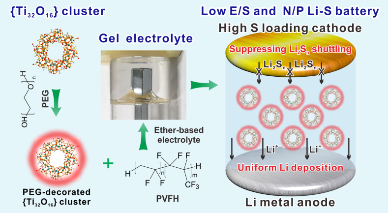 有鉴于此,方晓亮教授课题组和化学化工学院郑南峰教授课题组合作开发并宏量制备了聚乙二醇400修饰的Ti32O16团簇,将这种低聚物分子配位的金属氧团簇作为纳米填充材料与聚(偏二氟乙烯-co-六氟丙烯)(PVFH)共混制备出钛氧团簇基聚合物凝胶电解质。所得Ti32O16团簇尺寸均一、溶剂稳定性和分散性良好,在表面聚乙二醇配体与PVDF-HFP相互作用下,显著提升了聚合物凝胶电解质的成膜均匀性、机械性能和电化学稳定性,并能有效抑制锂枝晶的形成、降低高容量硫正极的穿梭效应。该凝胶聚合物电解质用于乙炔黑/硫正极(5 mgs cm-2)和锂金属负极配对制备的电池,可在贫电解液条件下稳定循环650次。所开发的高硫负载量的Li-S电池在低电解液/硫比(3 μL mgs-1)和低负/正极容量比(1:1)的条件下的能量密度高达423 Wh kg-1,并可持续循环100次。该研究为构建实用的高能量密度Li-S电池提供了新途径,同时也为金属氧团簇在Li-S电池中的应用研究提供了新思路。