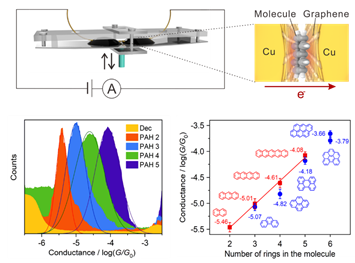针对这一问题,杨扬副教授课题组与洪文晶教授课题组在自主研发的机械可控裂结技术装置的基础上,开发了一种新型的层间裂结技术装置,用以构筑和表征单分子范德华异质结器件。研究人员将一系列多环芳烃化合物(Polycyclic Aromatic Hydrocarbons)分别嵌入在两片单层石墨烯电极之间,首次构筑了单分子范德华异质结器件,并对多种该类器件的电输运性质进行了表征。实验发现,利用该新型层间裂结技术所构筑的单分子范德华异质结,表现出与传统分子电子器件中所常见的面内输运明显不同的变化规律。实验中还发现,相同苯环数量、不同分子结构的异质结器件展现出不同的电输运性质,显示出典型的室温下量子输运特性。该工作所开发的新型层间裂结技术和构筑的单分子范德华异质结,对后续进一步研究和设计功能多样的单分子电子器件具有重要的参考价值。