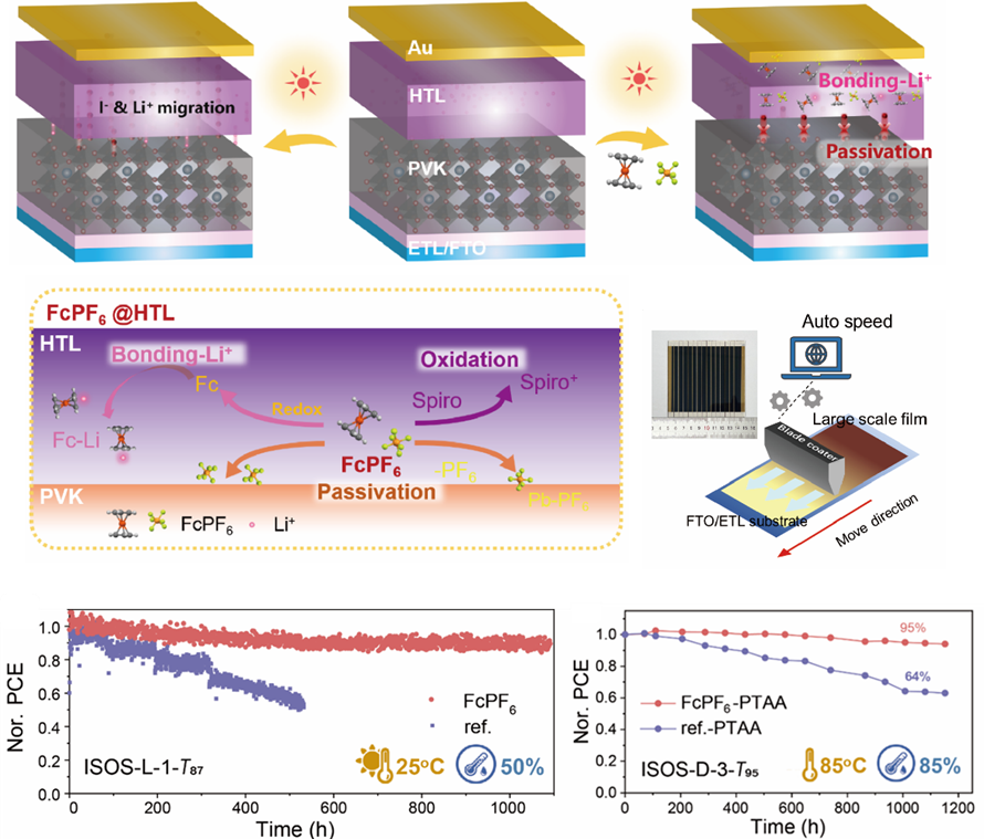 针对以上问题,研究团队通过引入多功能FcPF6添加剂来调控spiro-OMeTAD性能,进而实现高效稳定的PSMs;所引入的FcPF6中Fc+阳离子可迅速氧化spiro-OMeTAD,而减少的Fc副产物则与HTL中的Li+强结合,实现对Li+迁移的抑制;同时,PF6-阴离子能很好地稳定钙钛矿表面,通过配位效应阻止碘离子向上迁移。基于此策略,实现了常规PSC器件(0.12 cm2)PCE超过25%和100 cm2模组(有效面积为56 cm2)PCE超过20%的目标;与此同时,模组稳定性也得到了显著的改善,即使在工况1000小时的长期老化测试过程中仍可维持T87的输出效率。